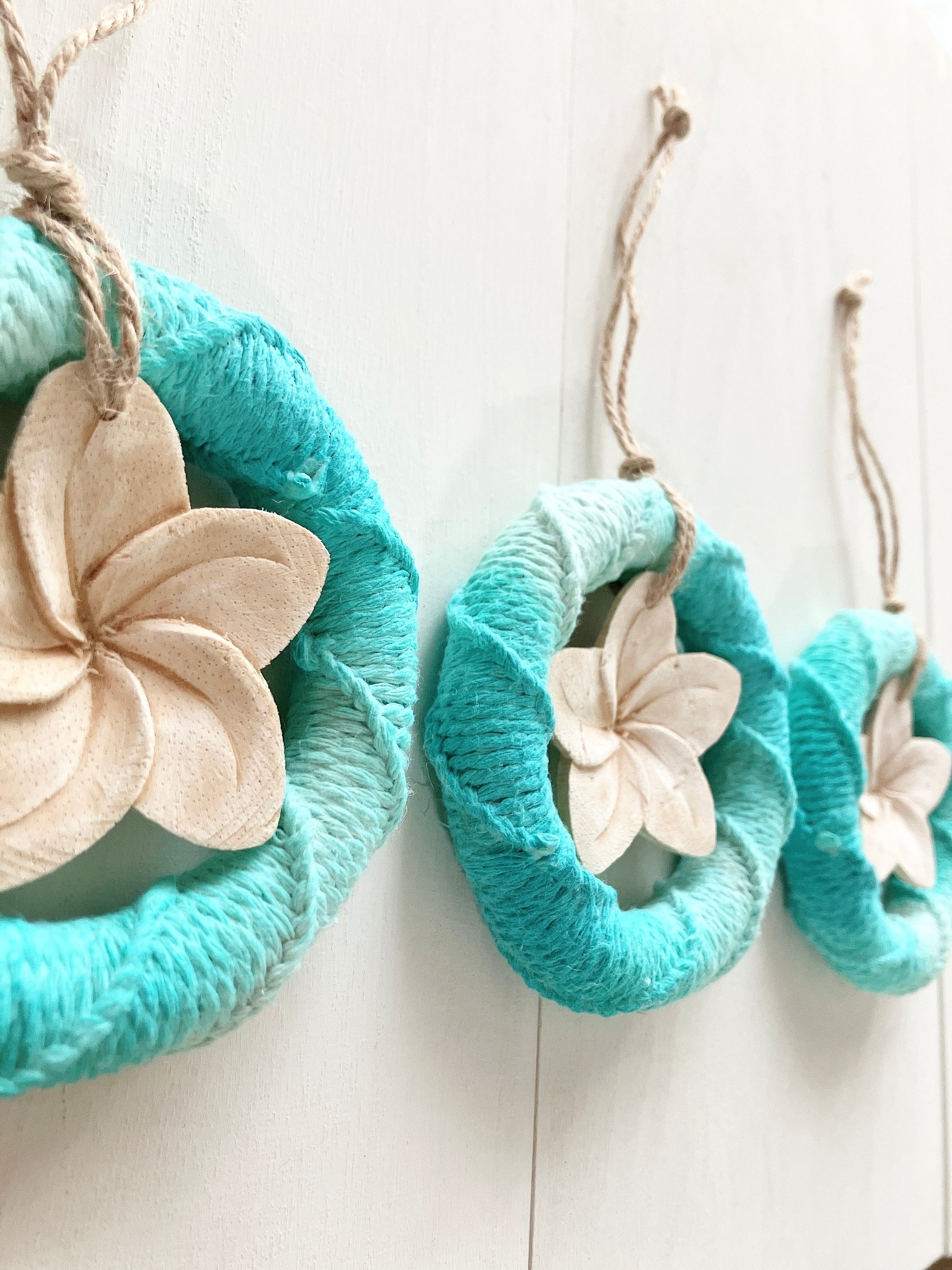 マクラメ編みした木製のリングをグラデーションに色染めしたアロマリース