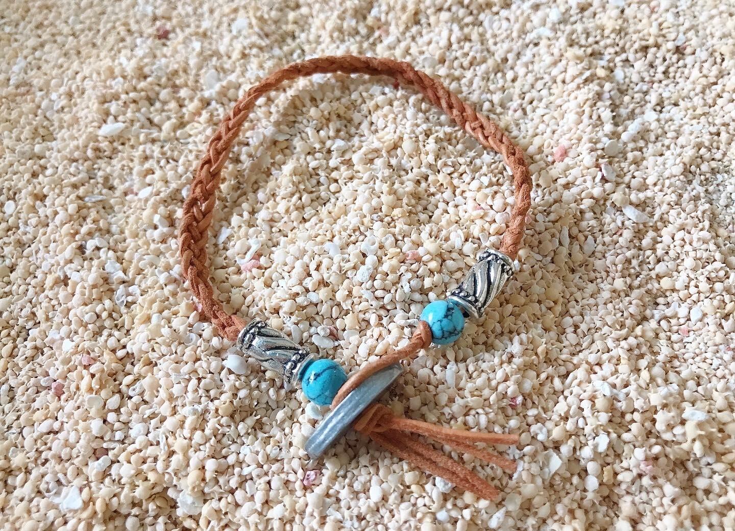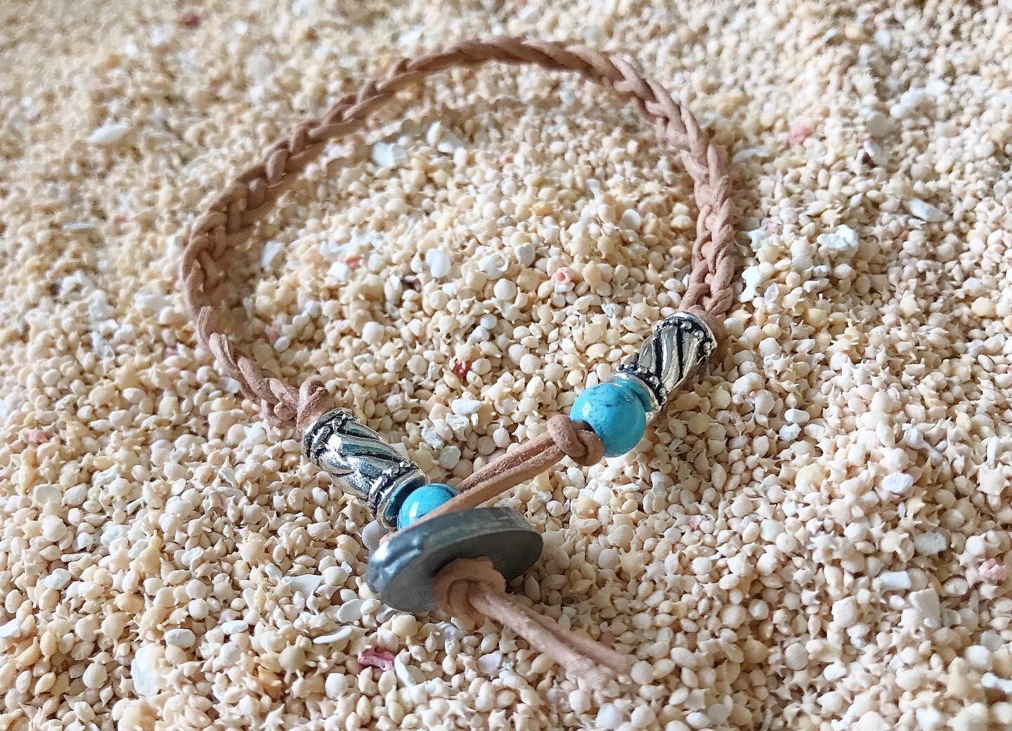 ターコイズとメタルビーズが可愛い革紐ブレスレット。